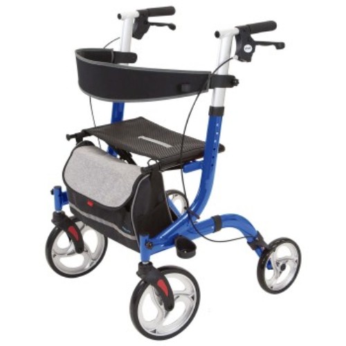 This rollator is made with a durable steel frame with height-adjustable handles and a padded backrest.